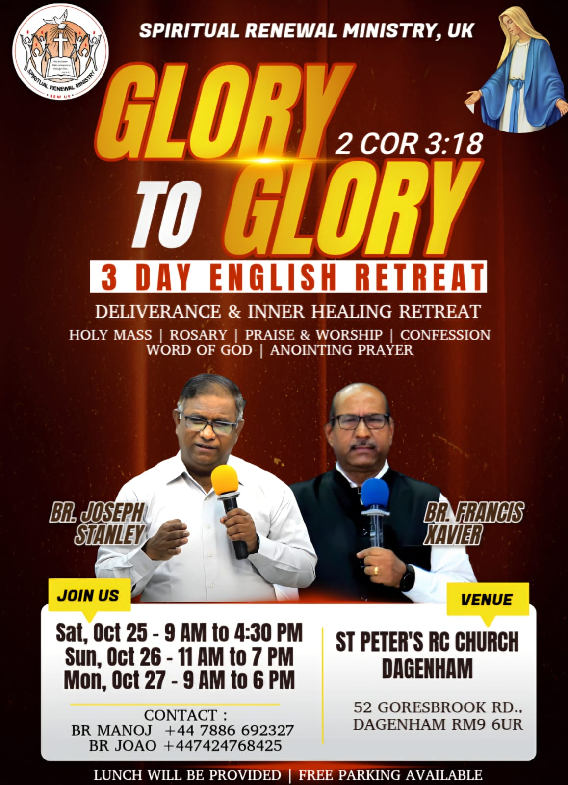 Glory to Glory is a 3-day English retreat hosted by SRM Ministry, focused on deliverance and inner healing through the power of the Holy Spirit. Designed for those seeking freedom, restoration, and a deeper encounter with Christ, this retreat offers Spirit-led worship, anointed preaching, and personal ministry. Participants are invited to move from bondage to breakthrough, from pain to peace, and from glory to greater glory in Jesus’ name.